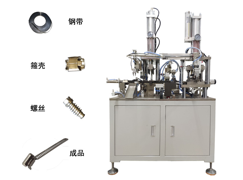该设备为美式自动锁螺丝机。箍头由振动盘送料并抓取到工装,钢带由伺服电机送料并由模具切断、成型,钢带与箍头经机械手抓取自动铆接,根部成型,再进行锁螺丝,最后下料。